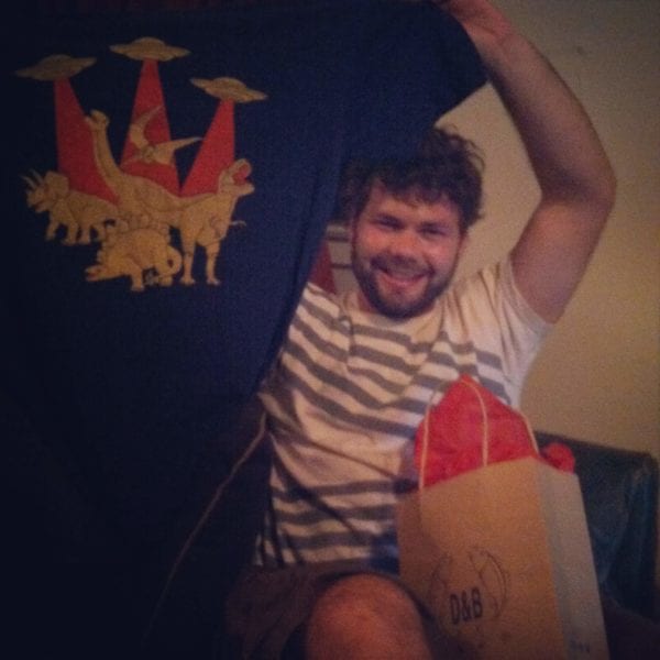 • Go online and purchase a cotton tee featuring aliens fighting dinosaurs in your partner’s size (note: your individual partner’s interests may vary. Consult his or her secret diary for further information).